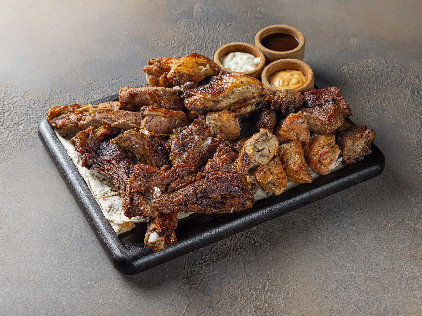 состоит из: бараньей корейки, ребрышек свиных, шашлыка из курицы, шашлыка из свинины. Подается с лавашом и соусами: тартар, сырный, кетчуп. Набор шашлыков для нескольких персон. Приготовлено с любовью и душой от наших профессиональных шеф-поваров, сделайте себе праздник души! Наслаждайтесь, приятного аппетита!